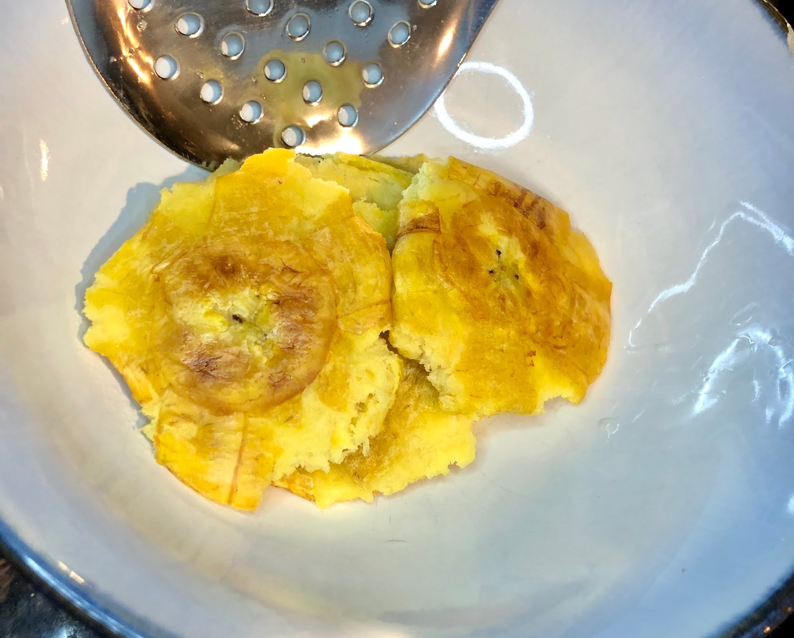 On the right, I have a tostonera (literally a "tostones maker"). Sometimes they come with an indentation so that you get a uniform shape when you smash it - I did some light finagling to reverse that so I wouldn't have the mold shape. If you buy one, don't get the really thick tostoneras that create a plantain "cup" either. I linked above to a place to buy them on Etsy, but you can get them at Walmart or Amazon in a pinch.